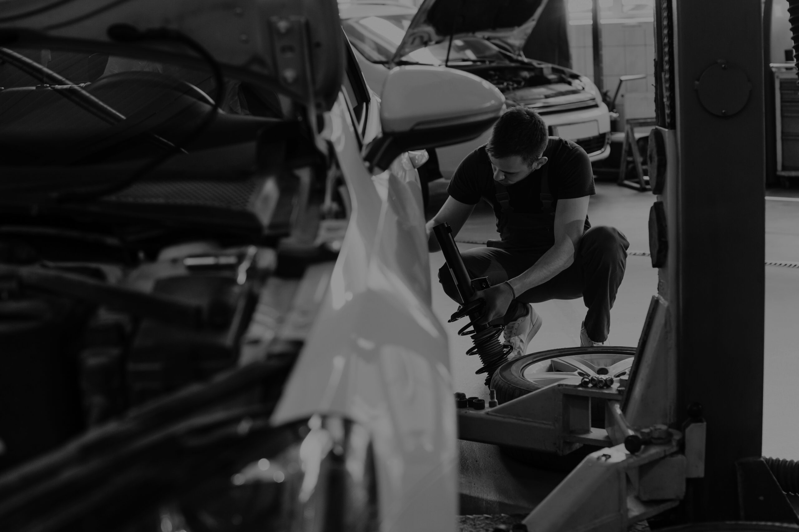 Man in work uniform repairs car indoors. Conception of automobile service